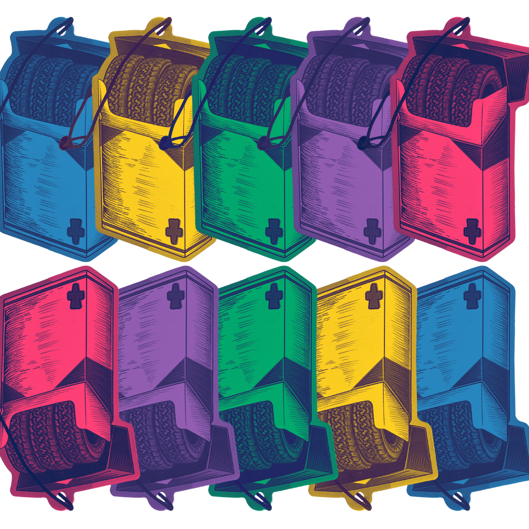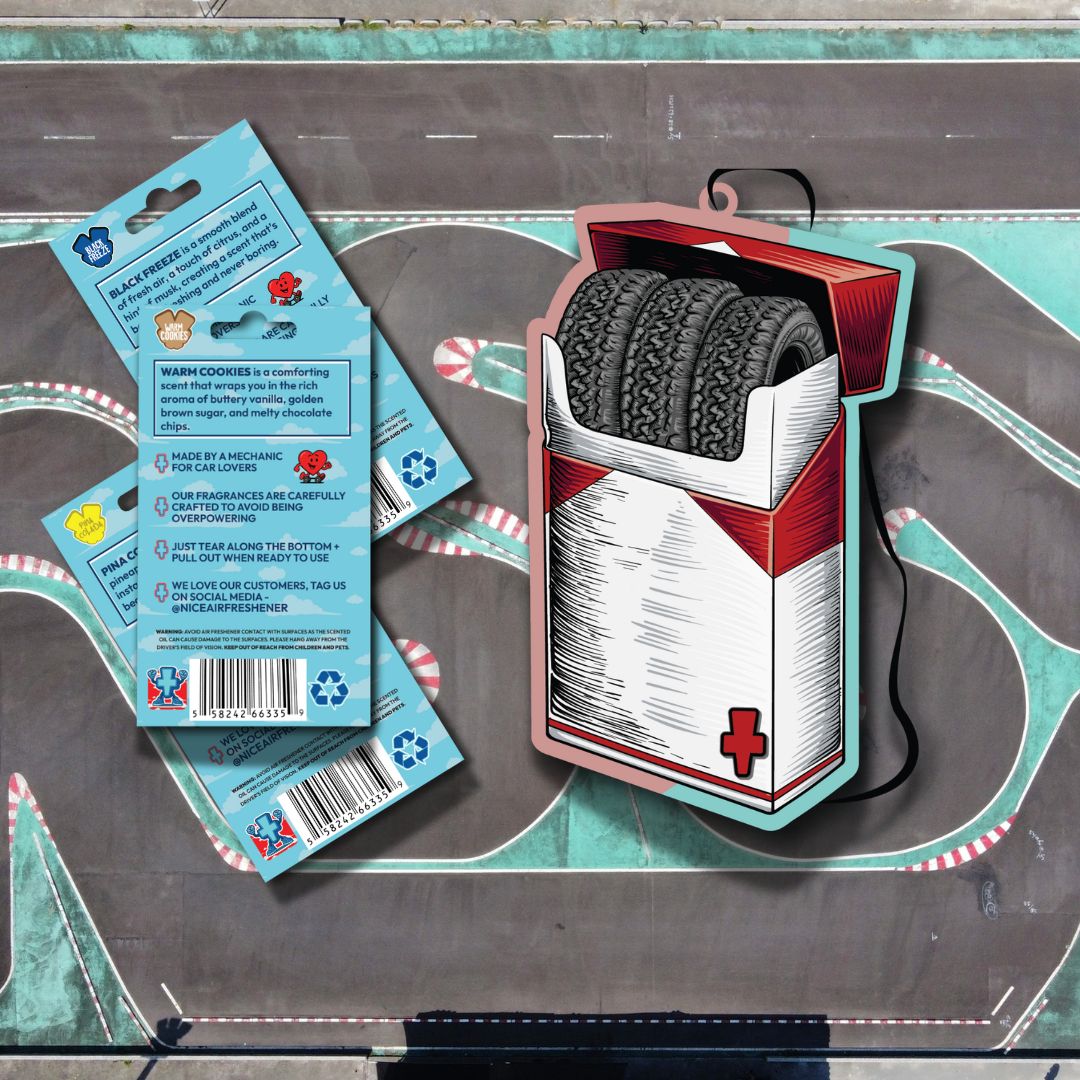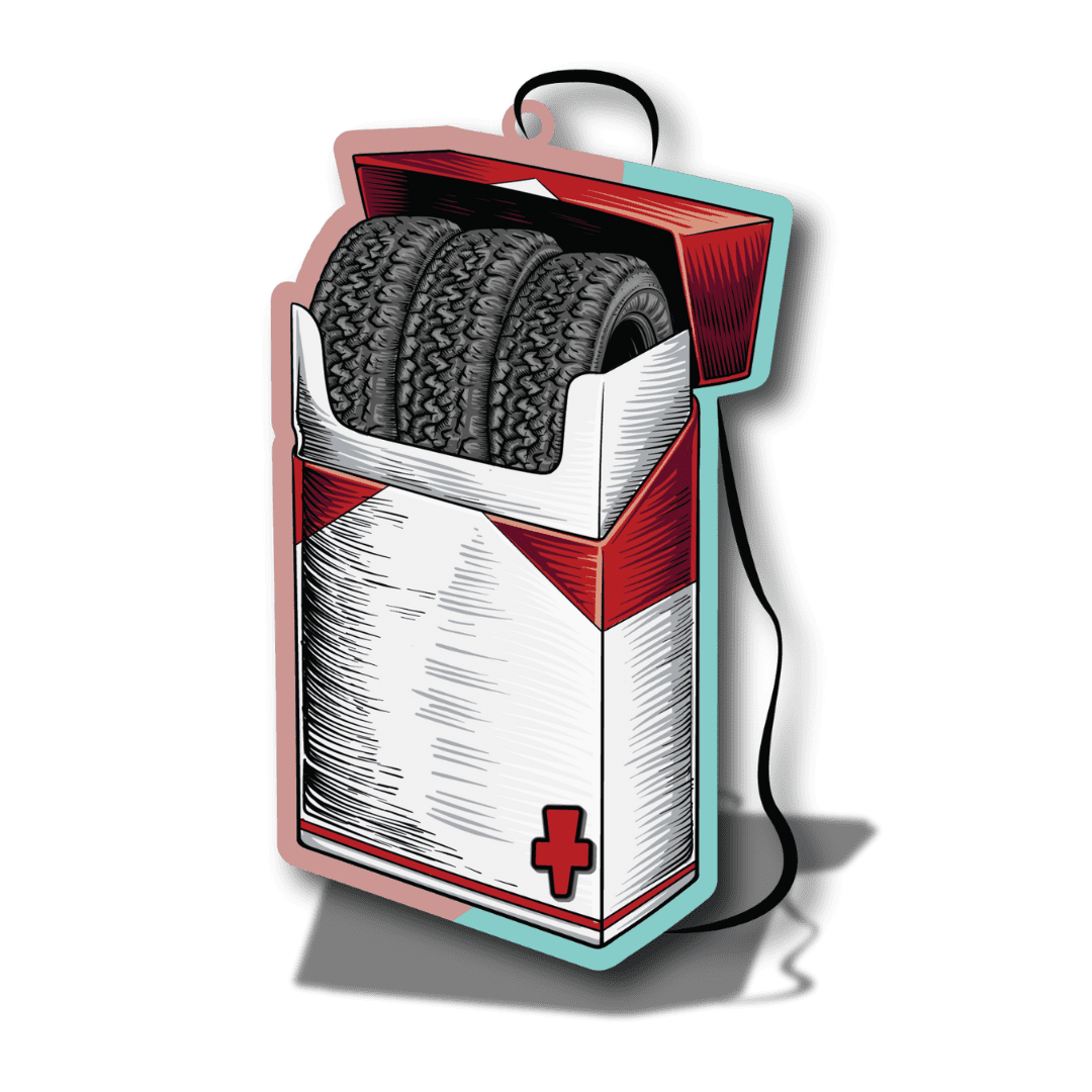 An air freshener featuring a smokin’ tires design that represents traction, no-traction, power, and performance.