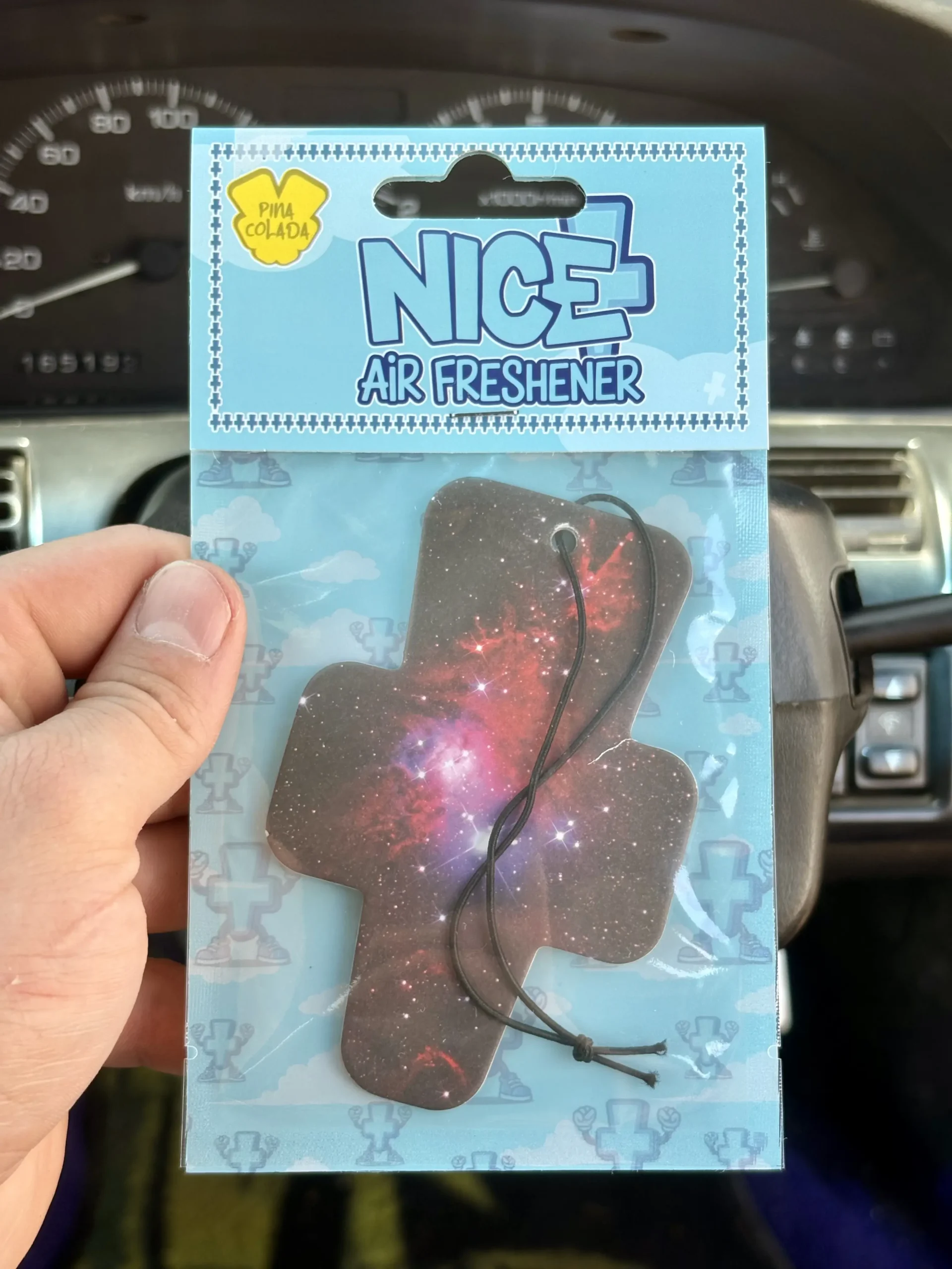 A real picture of the Cone Nebula superimposed on Nice Air Freshener’s logo.